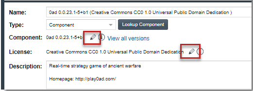 You can access the Update License Mapping window when registering or editing an instance of the component version and license in Lookup Component. This process described next is performed within the context of editing an inventory item.
