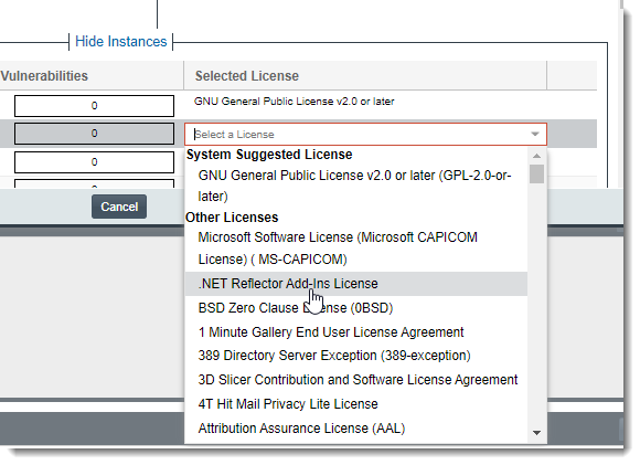 From the License dropdown, select the license that you want to identify as the user-preferred license. Be sure that you select the license from an appropriate license category on the dropdown, as described in License Selections Allowing Access to the “Update License Mapping” Window to ensure that Update License Mapping window will be opened. Alternatively, click New to create a custom license to map to the component version. Once you have defined the license on the Create Custom License window, click OK to return to the Edit Version/License window.