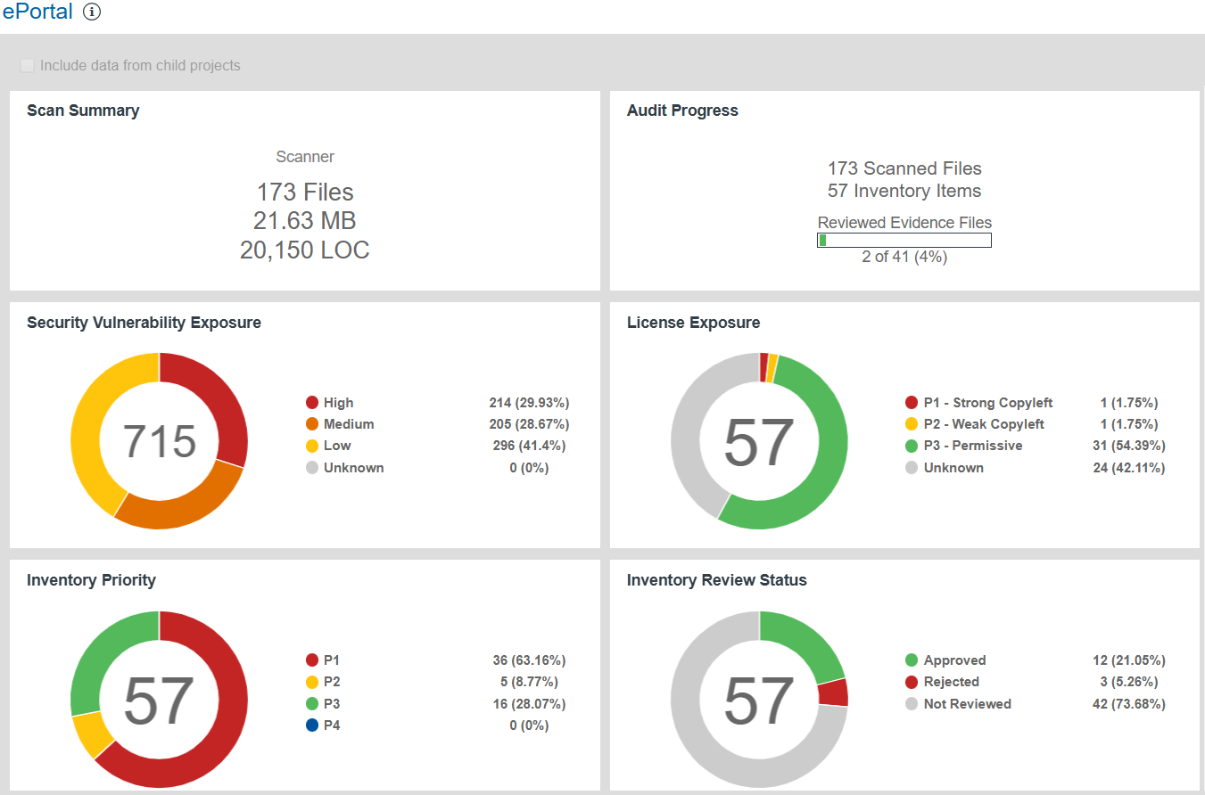 • Audit Progress—For a Scanner (server) scan, a snapshot of the audit progress that users have made on those files containing OSS or third-party evidence. No audit progress is shown for remote scans.