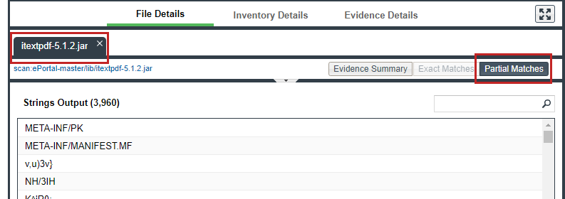 In the content of a given binary file (such as an object file, image, executable, and so forth) in the codebase, Code Insight can locate textual strings that might be evidence of open-source or other third-party code. Each string, consisting of at least three consecutive printable characters, might part of a comment, copyright, URL, email address, and another evidence type. Code Insight simply lists these strings on the Partial Matches tab; it does not show them highlighted within the context of the actual binary code (unlike non-binary files, in which Code Insight highlights evidence within the actual file content).