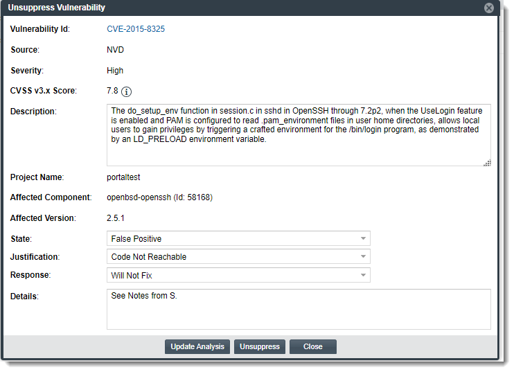 The Unsuppress button is enabled for only those vulnerabilities that you have permissions to unsuppress or on which to perform analysis updates. That is, you must be either a System Administrator or the Security Contact or Developer Contact for the project for which the given vulnerability was suppressed. For all other users, this button is disabled.
