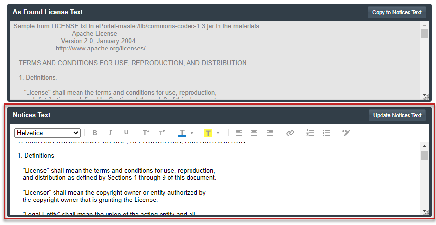 The Notices Text field is used to finalize the license text for use in the Notices report. (This field is located under the As-Found License Text field on the Notices Text tab for a selected inventory item in the Analysis Workbench and in Project Inventory.) For example, you can copy the contents of the As-Found License Text field to this field and modify the text as needed. Alternatively, you can pull in the current license text from the Code Insight Data Library (and modify it as needed); or you can simply provide your own Notices content in this field.